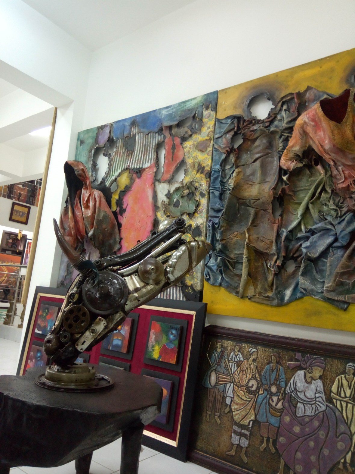 Nike Art Gallery is Big. Large. Massive. It holds an uncountable number of art work in its Four Floors. Every space is a sight to behold. All of the art works are of Nigerian origin and by Nigerian artists. From the digital and metal work to the wooden sculptures and to paintings. Name it. Chiffon materials in tie and dye style can be seen on the ground floor with ankara bags, attire, ankara bracelets, etc.