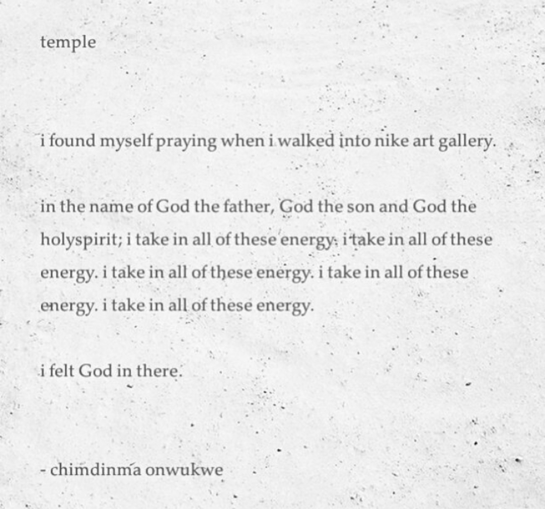 I remember the first time I walked into Nike Art Gallery. It was an accident. It was not planned. I was sent to a client’s place at Ikate. I was so tired on my way back. I remember walking down the street and seeing Nike Art Gallery in all its glory. I took calculated steps to get to the entrance. And I asked if I could just look around.