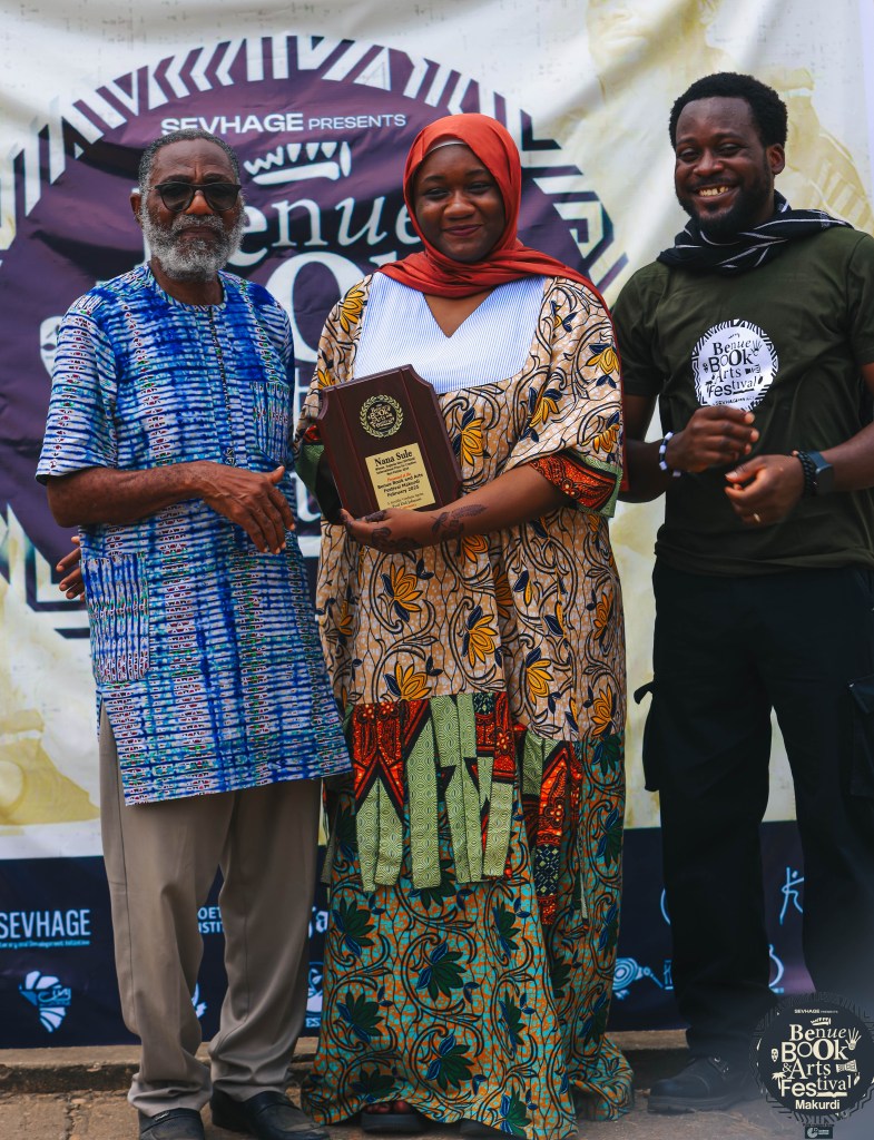 Professor Dul Johnson (multiple award-winning SEVHAGE author), Nana Sule (showing her plaque for the award of Winner, Eugenia Abu/SEVHAGE International Prize for Creative Non-Fiction), and S. Su’eddie Vershima Agema